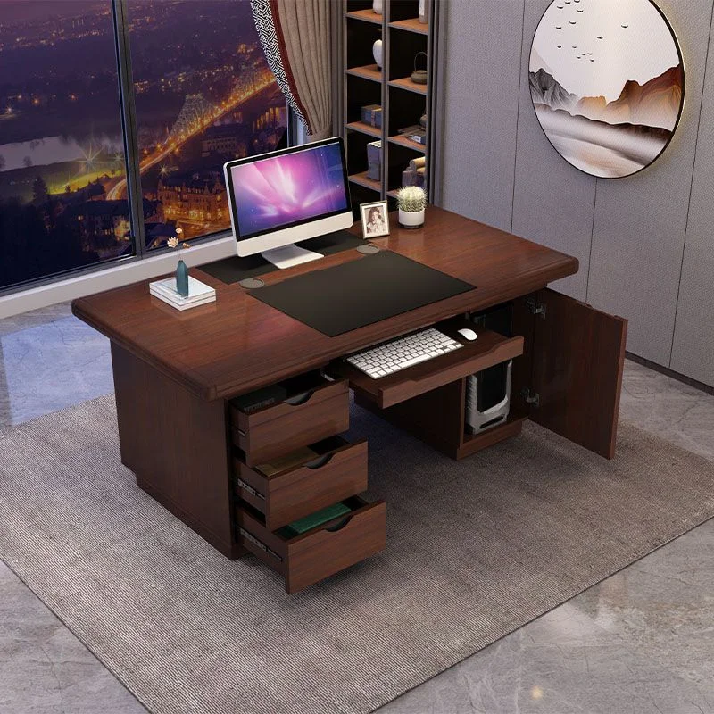 The desk is equipped with integrated storage solutions, including drawers and a lockable cabinet. Ensuring your workspace remains organized and clutter-free. Built with durability in mind, the sturdy frame and premium surface materials are resistant to wear and scratches, promising long-lasting use.