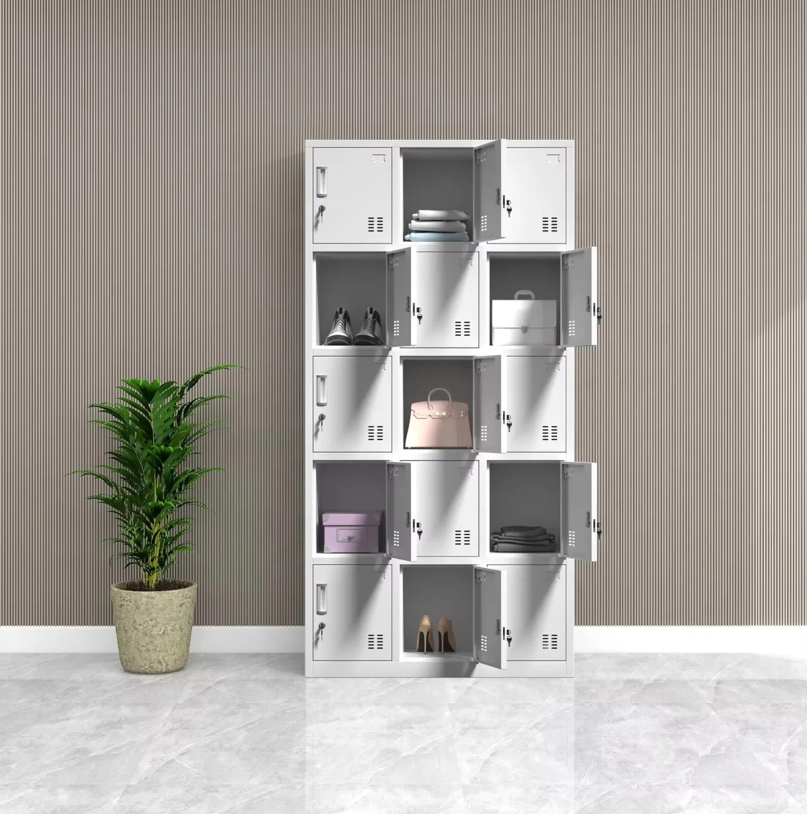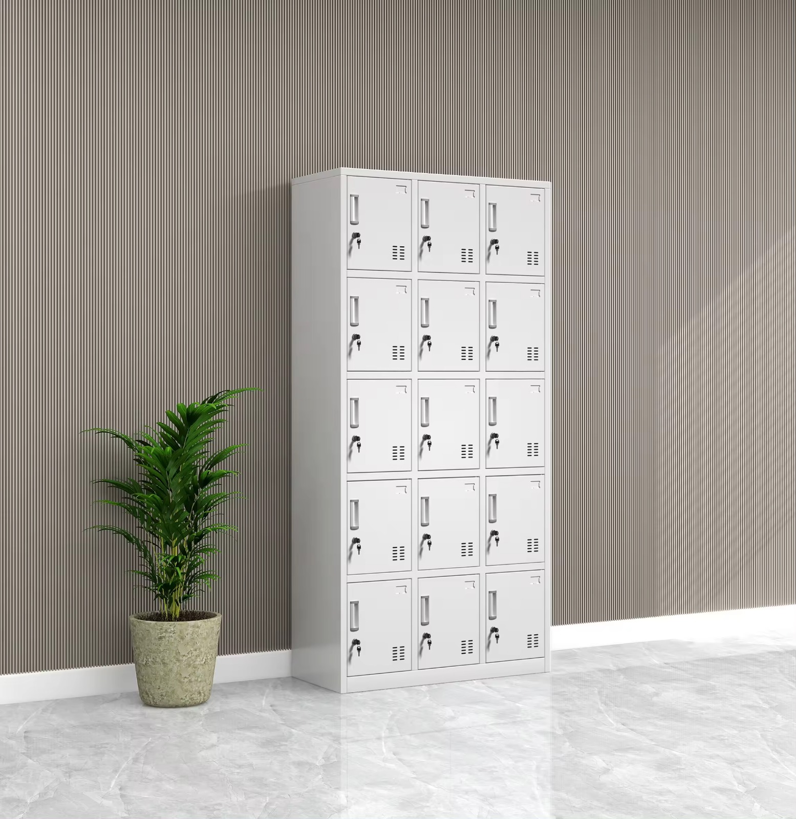 With its fifteen lockable compartments, our steel office cabinet provides secure storage for multiple users. Each locker is equipped with a reliable locking mechanism, ensuring the safety and privacy of stored items.
