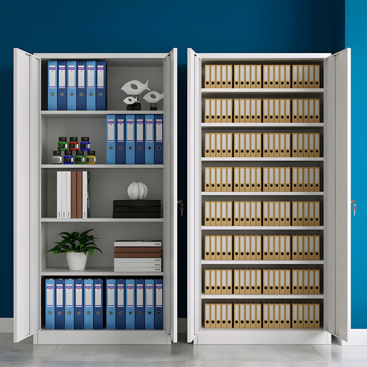 The sturdy metal cabinet with 2 sections, and double swinging doors in each section. There are shelves in each section for maximum utilization of space. And all doors are lockable for the security of important items.