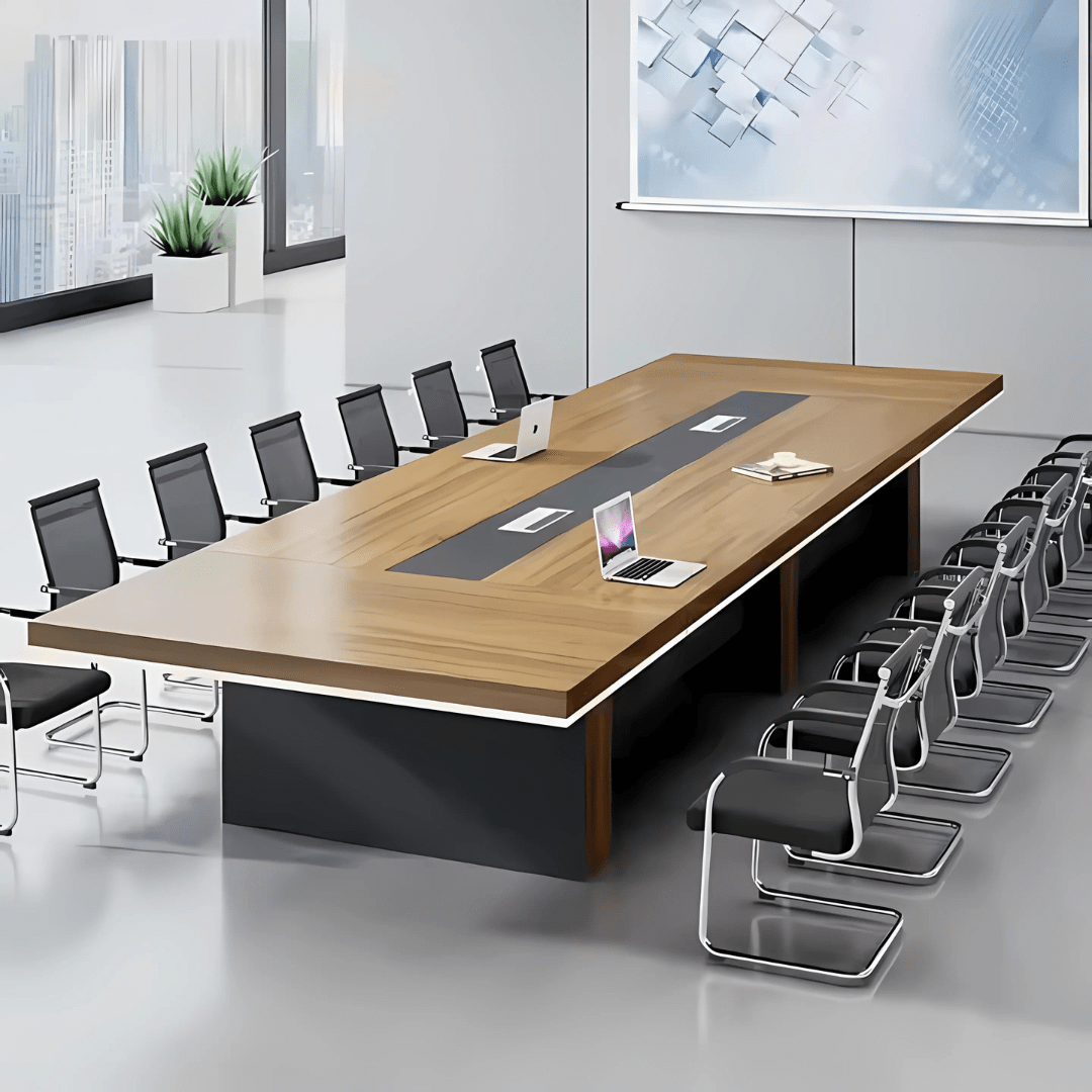 This boardroom table is designed with practicality in mind. Integrated cable management channels keep wires organized and hidden, maintaining a clean and clutter-free surface. Its robust legs and frame provide excellent support while complementing the overall aesthetic of modern office interiors.