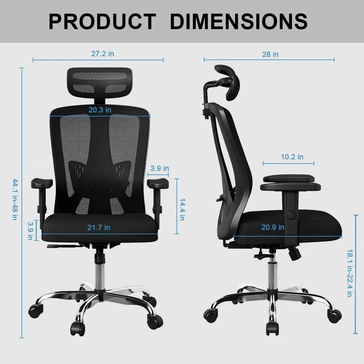 - Flexible Adjustments: Our ergonomic office chair features a multi-stage height-adjustable headrest, lumbar support, and armrests for a customized fit. The ergonomic office chair can be tilted from 90° to 120° to 145°, and the height is adjustable from 15 to 18 inches.