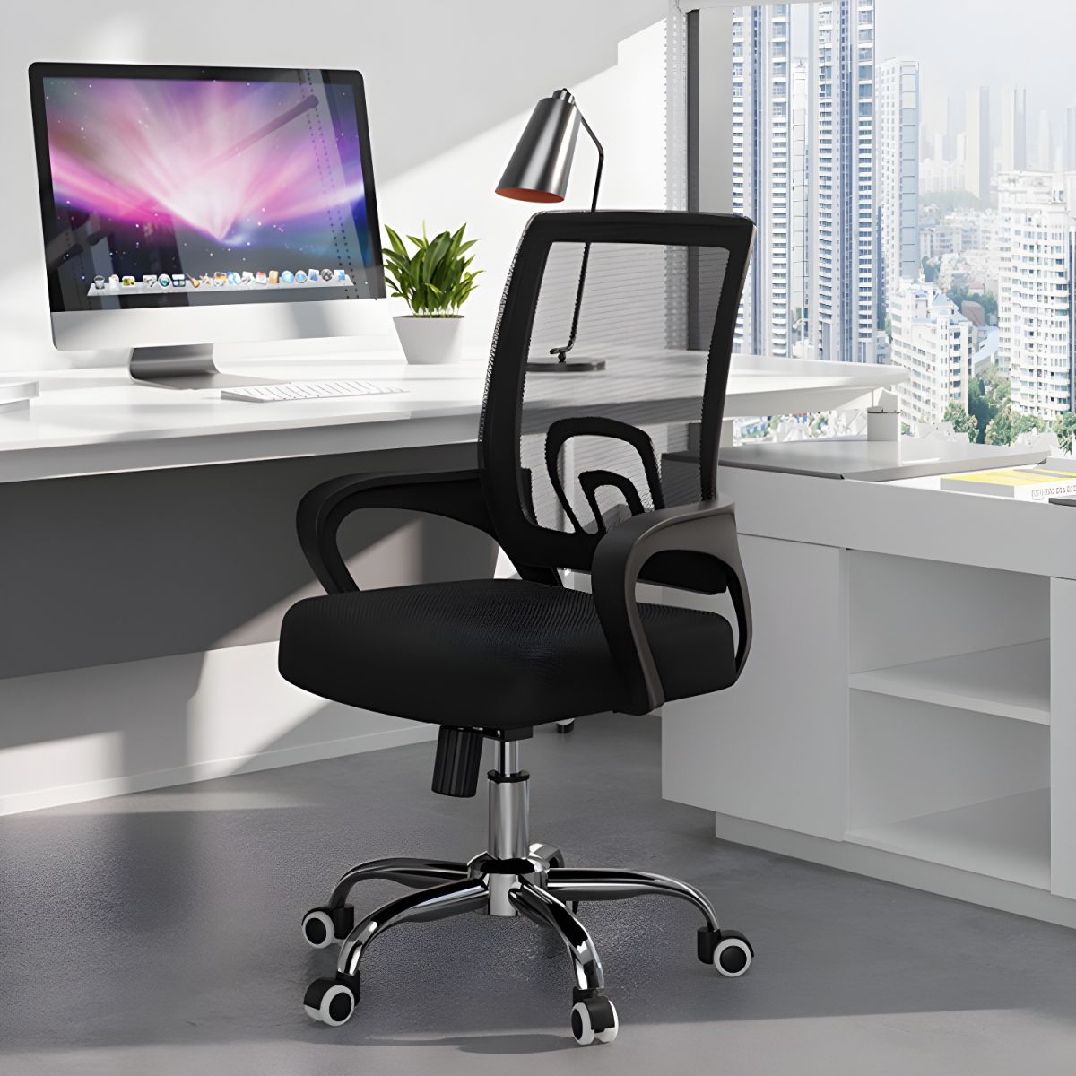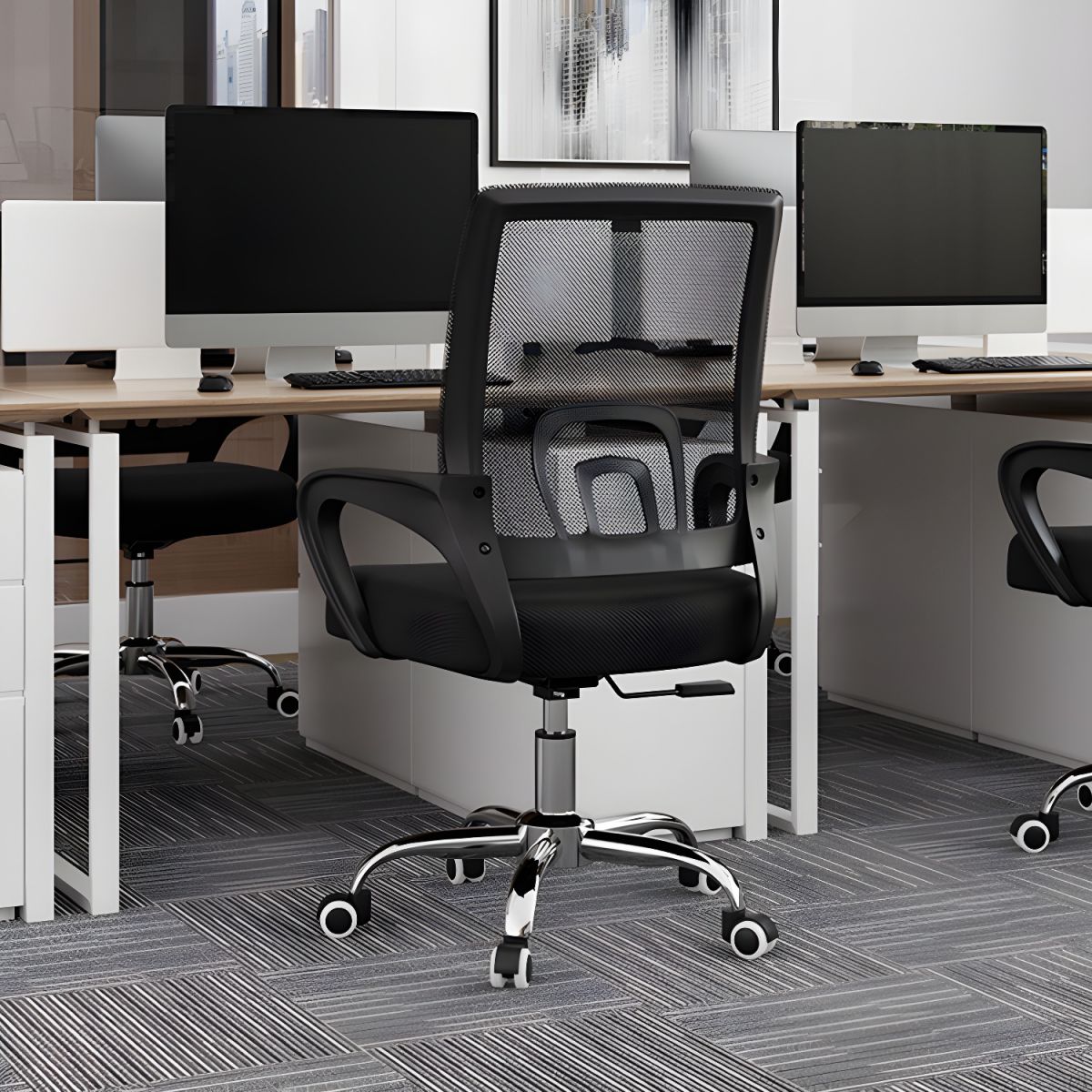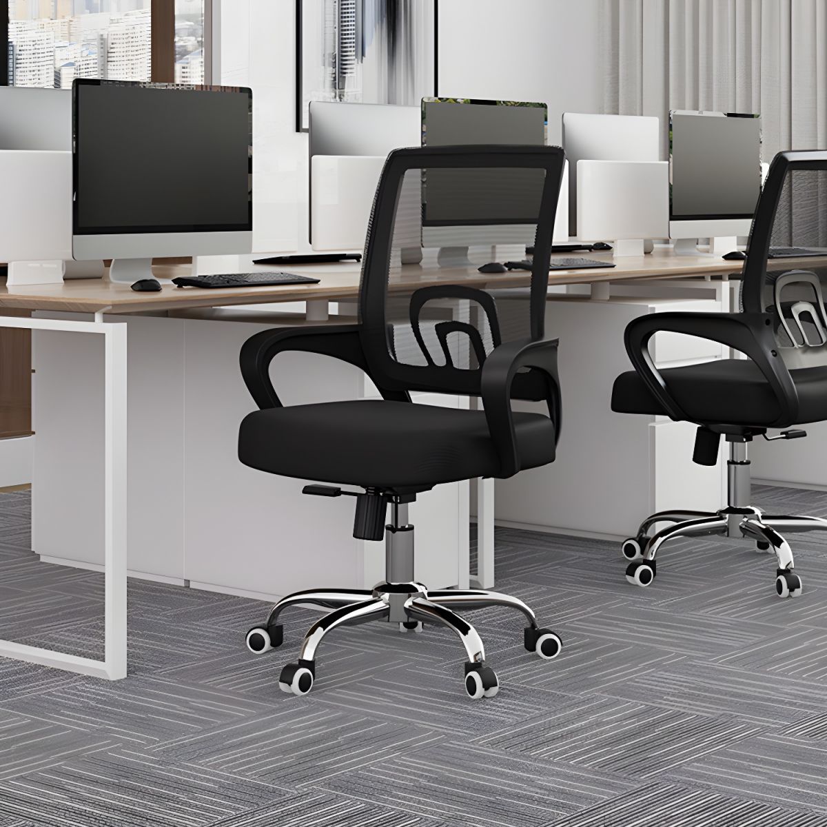 The Mid Back Steel Base Office Chair features a modern design that effortlessly complements any office decor. The sleek, mid-back profile provides a contemporary look, while the high-quality fabric or leather upholstery offers a touch of elegance. Its minimalist design is perfect for both home offices and corporate environments, making it a versatile choice for various settings.