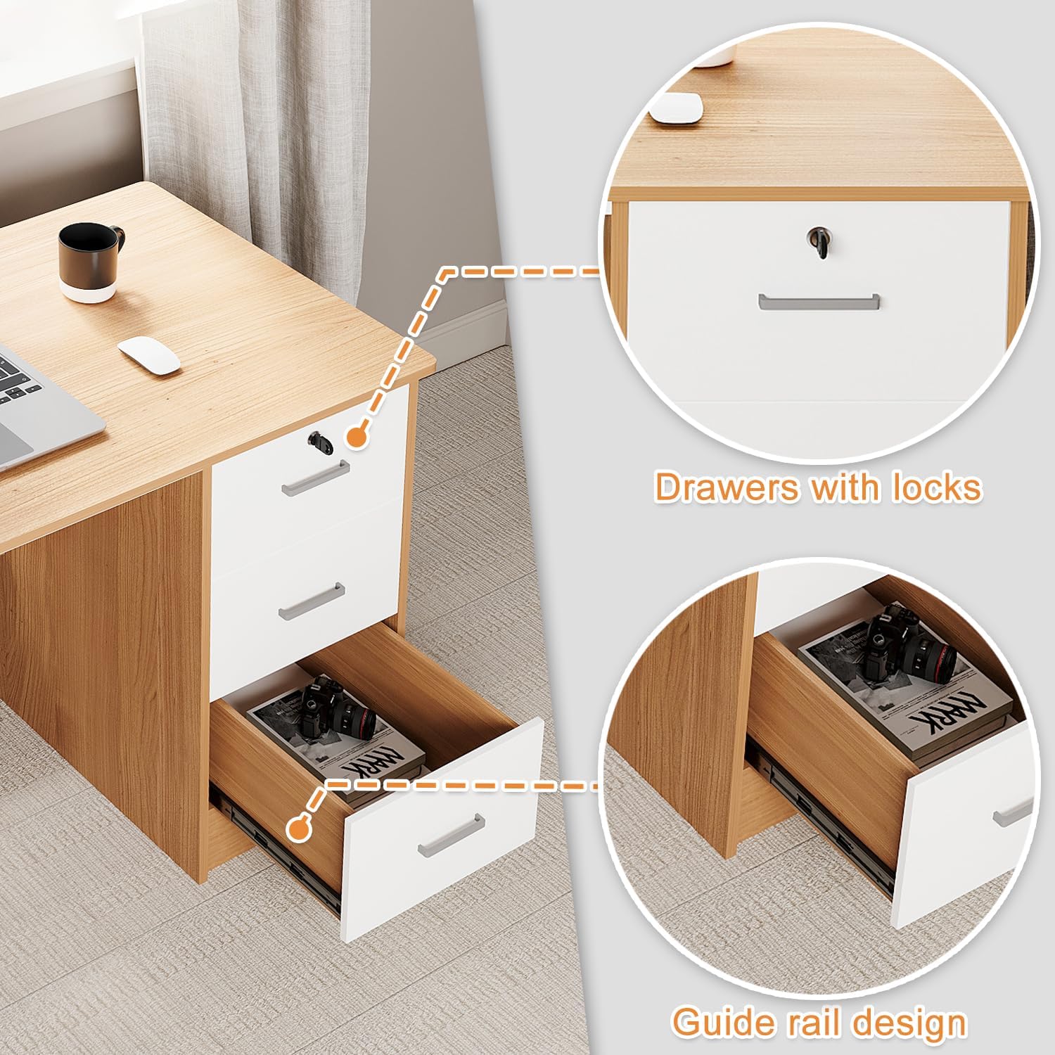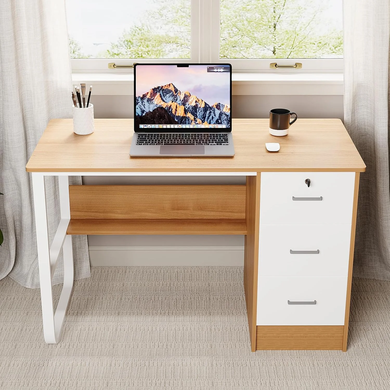 In addition to its spacious desktop, this office desk includes convenient storage shelves. The shelves offer extra space to store books, files, or decorative items, helping to keep your workspace neat and organized. Whether you need a place for office supplies or personal items, these shelves provide a practical solution for reducing clutter and maximizing space.