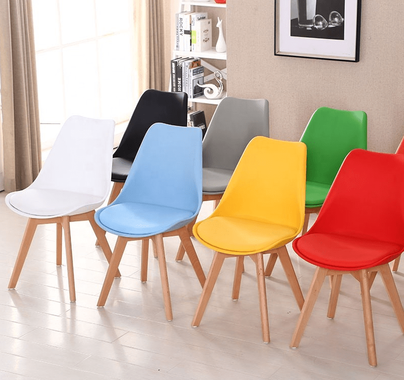 This chair suits a variety of settings. It works beautifully in dining rooms, offices, living rooms, and cafés. Moreover, it comes in several attractive colors—white, black, grey, beige, and pastel tones. You can mix and match to express your personal style. Besides, its compact design fits perfectly in small spaces while maintaining a modern, bold presence.