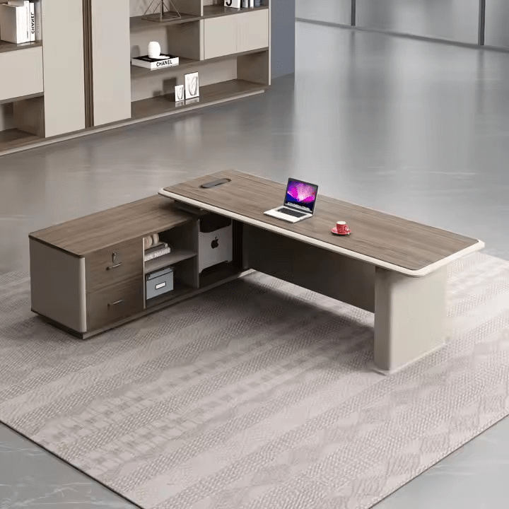 To keep your essentials within reach but out of sight, the desk includes integrated storage options such as lockable drawers, side cabinets, and open shelves (depending on the model). These thoughtful features allow for better organization and improved workflow. Additionally, built-in cable management ensures a clean and tidy surface.
