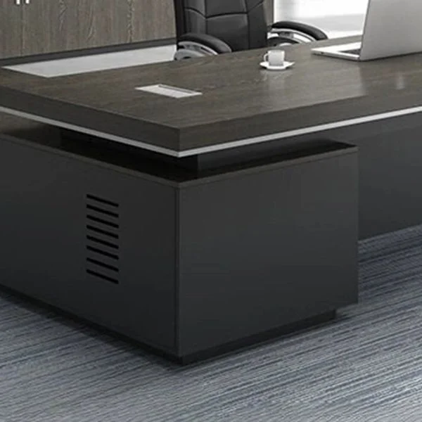 Stay organized with integrated storage options. The desk typically includes drawers, cabinets, or shelves for convenient storage of office supplies, files, and personal belongings, keeping your workspace clutter-free and efficient.